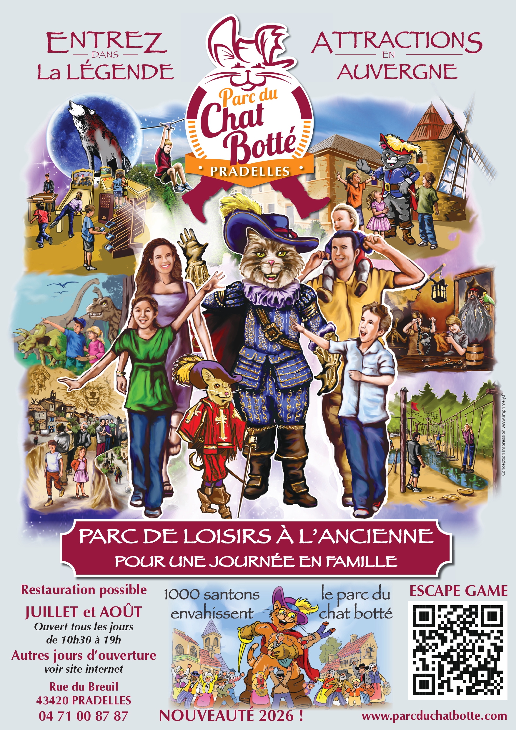 Le parc du Chat Botté vous replonge dans les années 1900, une époque où les traditions, les légendes, les mythes, les métiers et le savoir faire d’Antan composent tout un art de vivre. C’est un site incontournable en Auvergne. C’est le lieu où l’imaginaire mêle le réel et l’irréel dans de fabuleux décors de cinéma.